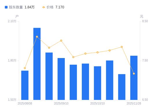 近一年(2024年11月29日至2025年11月28日),日科化学A股股东户数从1.63万户,增加至1.84万户,增幅12.94%,区间股价上涨21.32%。