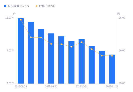12月1日消息,数据显示,截至2025年11月28日,京北方A股股东总户数为8.76万户,较上期(2025年11月20日)减少2326户,降幅2.59%。公司最新A股总股本为8.67亿股,其中流通A股8.44亿股,户均持有流通A股数量为9626.02股,较上期增加248.9股,增幅2.65%;户均持流通A股市值18.51万元,较上期增加4598.71元,增幅2.55%。