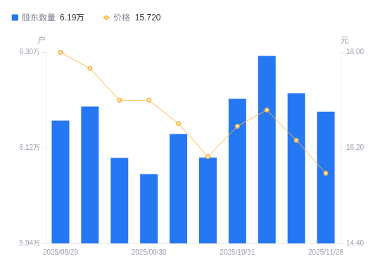 近一年(2024年11月29日至2025年11月28日),欧普康视A股股东户数从6.67万户,减低至6.19万户,降幅7.27%,区间股价下跌13.72%。