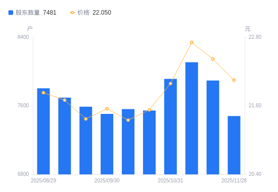 近一年(2024年11月29日至2025年11月28日),港通医疗A股股东户数从9644户,减低至7481户,降幅22.43%,区间股价上涨7.27%。