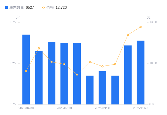 近一年(2024年11月29日至2025年11月10日),ST路通A股股东户数从7100户,减低至6469户,降幅8.89%,区间股价上涨42.33%。