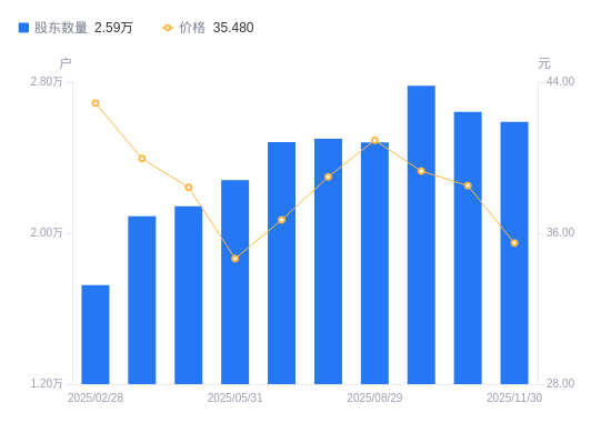 近一年(2024年11月30日至2025年11月30日),瑞鹄模具A股股东户数从2.17万户,增加至2.59万户,增幅19.30%,区间股价上涨10.60%。