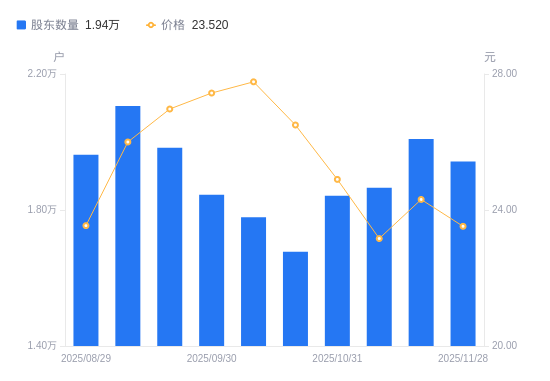 近一年(2024年11月29日至2025年11月28日),华纬科技A股股东户数从9664户,增加至1.94万户,增幅100.98%,区间股价上涨62.59%。