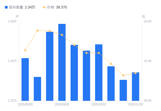 近一年(2024年11月29日至2025年11月28日),肇民科技A股股东户数从1.35万户,增加至2.34万户,增幅73.72%,区间股价上涨120.52%。