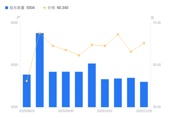 近一年(2024年11月29日至2025年11月28日),开创电气A股股东户数从8918户,减低至5504户,降幅38.28%,区间股价上涨171.19%。
