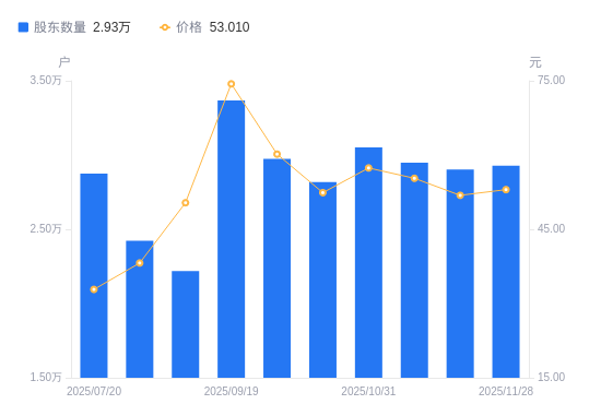 12月1日消息,数据显示,截至2025年11月20日,隆扬电子A股股东总户数为2.9万户,较上期(2025年11月10日)减少453户,降幅1.54%。公司最新A股总股本为2.83亿股,其中流通A股8456.9万股,户均持有流通A股数量为2913.66股,较上期增加44.78股,增幅1.56%;户均持流通A股市值15.11万元,较上期减少7546.92元,降幅4.76%。