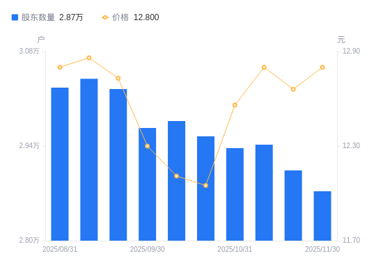 近一年(2024年12月10日至2025年11月30日),中成股份A股股东户数从3.19万户,减低至2.87万户,降幅9.84%,区间股价下跌21.13%。