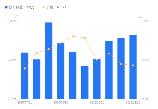 近一年(2024年11月20日至2025年11月20日),圣农发展A股股东户数从3.83万户,减低至3.64万户,降幅4.85%,区间股价上涨13.86%。