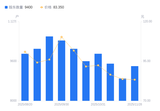 近一年(2024年11月29日至2025年11月28日),儒竞科技A股股东户数从1.2万户,减低至9400户,降幅21.67%,区间股价上涨39.17%。