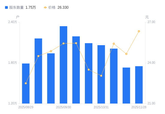 近一年(2024年11月29日至2025年11月28日),多利科技A股股东户数从1.72万户,增加至1.75万户,增幅1.74%,区间股价上涨29.27%。