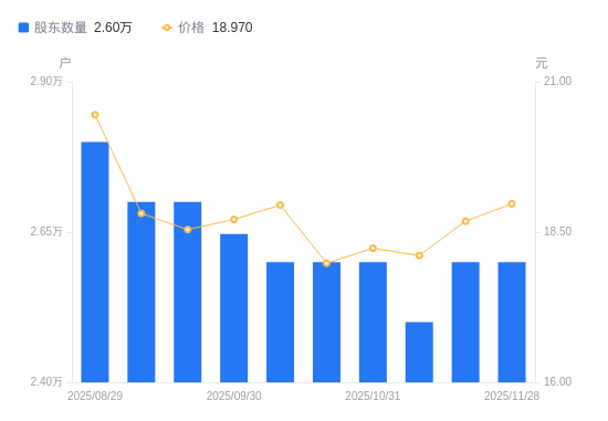 近一年(2024年11月29日至2025年11月28日),会畅通讯A股股东户数从2.97万户,减低至2.6万户,降幅12.46%,区间股价下跌10.18%。