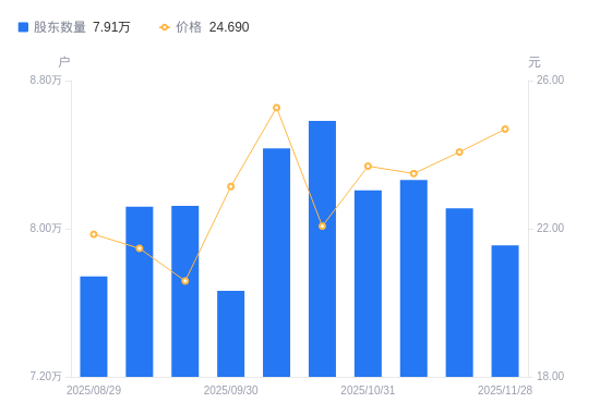 近一年(2024年11月29日至2025年11月28日),锡业股份A股股东户数从8.68万户,减低至7.91万户,降幅8.82%,区间股价上涨74.61%。