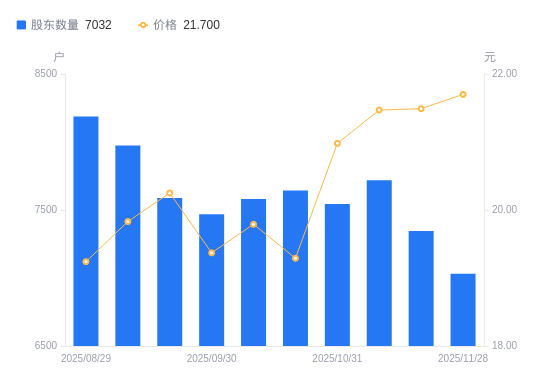 近一年(2024年11月29日至2025年11月28日),*ST声迅A股股东户数从1.44万户,减低至7032户,降幅51.11%,区间股价下跌21.15%。