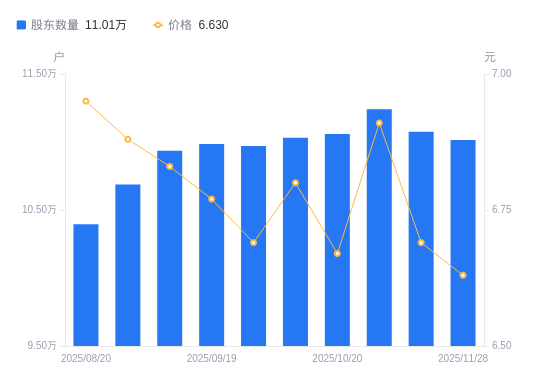 近一年(2024年11月29日至2025年11月28日),上海莱士A股股东户数从9.52万户,增加至11.01万户,增幅15.69%,区间股价下跌11.33%。