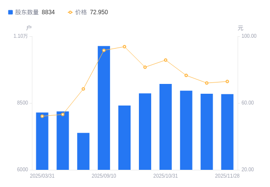 近一年(2024年12月31日至2025年11月28日),骏鼎达A股股东户数从8629户,增加至8834户,增幅2.38%,区间股价上涨27.34%。