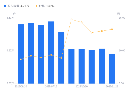 12月2日消息,数据显示,截至2025年11月28日,宁波东力A股股东总户数为4.77万户,较上期(2025年11月20日)减少2144户,降幅4.30%。公司最新A股总股本为5.32亿股,其中流通A股4.8亿股,户均持有流通A股数量为1.01万股,较上期增加432.77股,增幅4.50%;户均持流通A股市值13.34万元,较上期增加8337.78元,增幅6.67%。