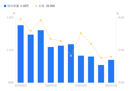 近一年(2024年12月10日至2025年11月28日),瑞德智能A股股东户数从1.24万户,减低至1.08万户,降幅13.17%,区间股价上涨3.17%。