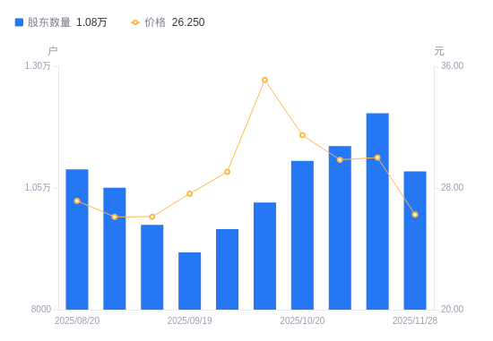 近一年(2024年11月29日至2025年11月28日),金春股份A股股东户数从1.07万户,增加至1.08万户,增幅1.52%,区间股价上涨63.01%。