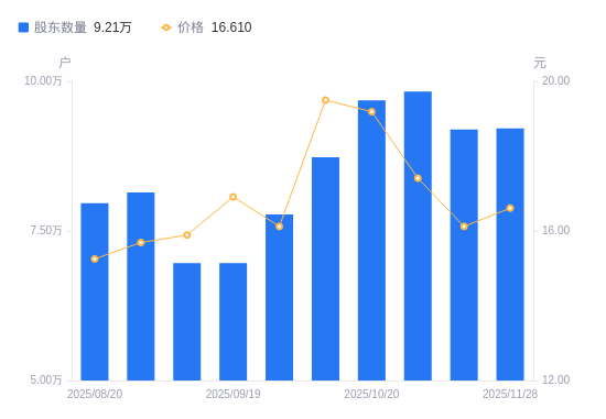 近一年(2024年11月29日至2025年11月28日),新疆交建A股股东户数从5万户,增加至9.21万户,增幅84.27%,区间股价上涨32.35%。