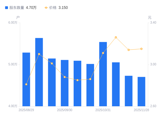 近一年(2024年11月29日至2025年11月28日),南山控股A股股东户数从4.57万户,增加至4.7万户,增幅2.79%,区间股价上涨17.98%。