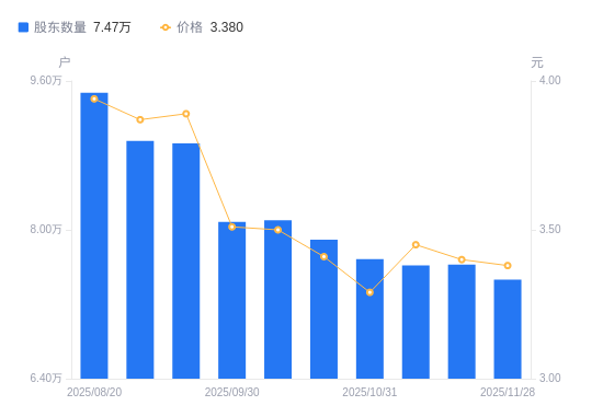 近一年(2024年11月30日至2025年11月28日),金一文化A股股东户数从2.68万户,增加至7.47万户,增幅178.92%,区间股价上涨32.55%。