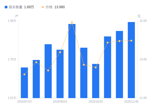 近一年(2024年12月10日至2025年11月30日),东亚机械A股股东户数从1.59万户,增加至1.89万户,增幅18.30%,区间股价上涨21.99%。