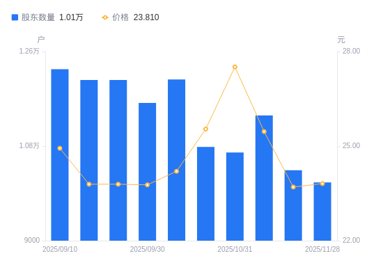 近一年(2024年11月29日至2025年11月28日),聚杰微纤A股股东户数从9213户,增加至1.01万户,增幅9.70%,区间股价上涨70.68%。