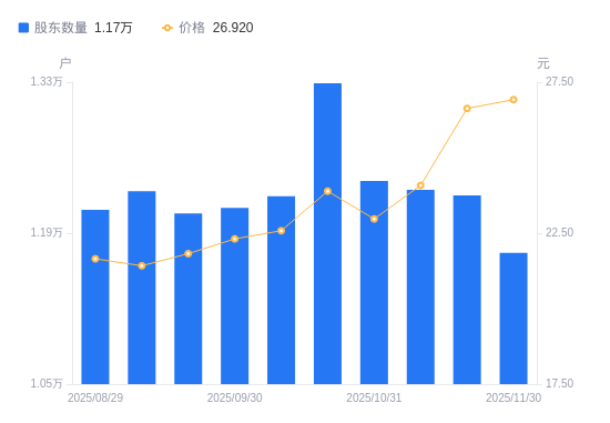 近一年(2024年12月10日至2025年11月30日),尤安设计A股股东户数从1.4万户,减低至1.17万户,降幅16.49%,区间股价上涨39.41%。