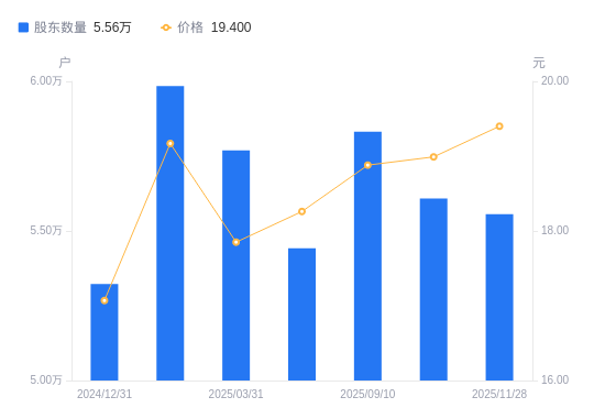 近一年(2024年12月31日至2025年11月28日),久远银海A股股东户数从5.32万户,增加至5.56万户,增幅4.39%,区间股价上涨8.62%。