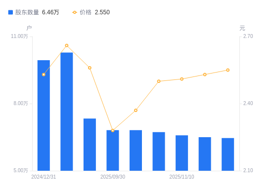 近一年(2024年12月31日至2025年11月20日),*ST四环A股股东户数从9.94万户,减低至6.5万户,降幅34.58%,区间股价下跌3.07%。