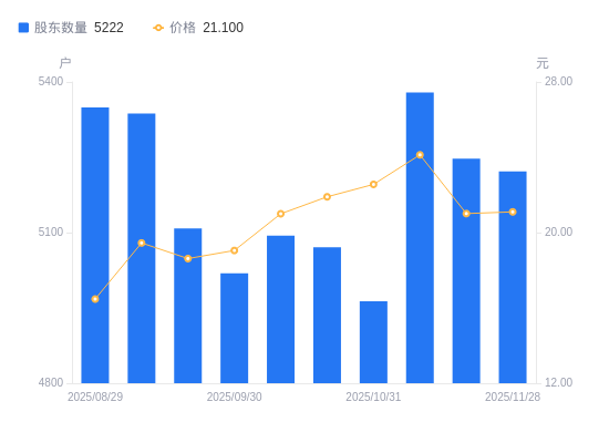 近一年(2024年11月29日至2025年11月28日),*ST和科A股股东户数从6775户,减低至5222户,降幅22.92%,区间股价下跌6.26%。
