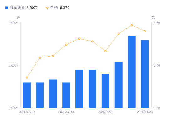 近一年(2024年12月20日至2025年11月28日),友发集团A股股东户数从2.7万户,增加至3.6万户,增幅33.33%,区间股价上涨18.89%。