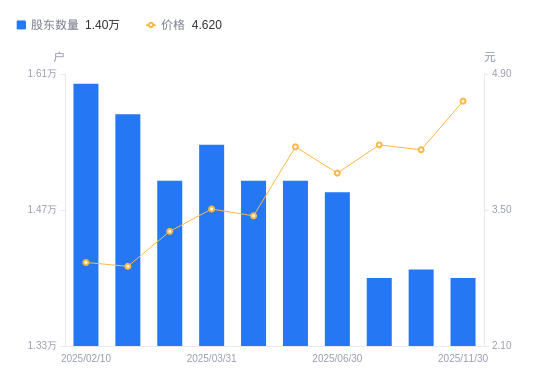 近一年(2024年12月20日至2025年11月30日),*ST名家A股股东户数从1.7万户,减低至1.4万户,降幅17.65%,区间股价上涨35.88%。