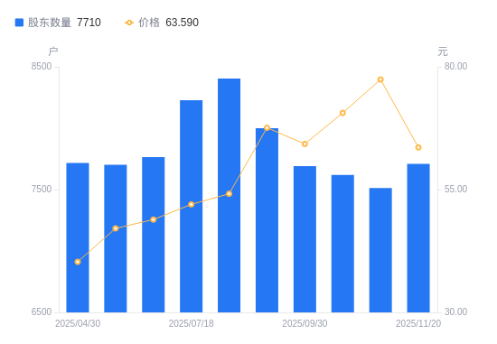 近一年(2024年12月20日至2025年11月20日),硕世生物A股股东户数从8109户,减低至7710户,降幅4.92%,区间股价上涨46.94%。