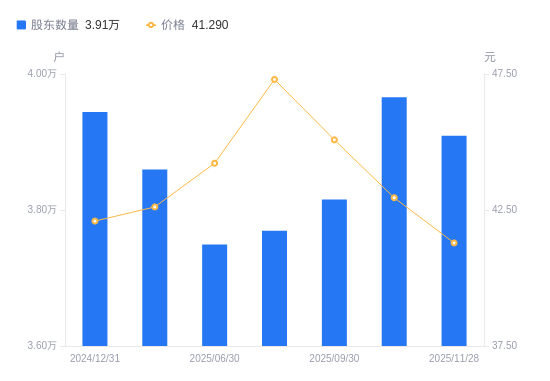 近一年(2024年12月31日至2025年11月28日),贝泰妮A股股东户数从3.94万户,减低至3.91万户,降幅0.88%,区间股价下跌4.23%。