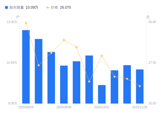 近一年(2024年11月29日至2025年11月28日),云南锗业A股股东户数从12.02万户,减低至10.09万户,降幅16.01%,区间股价上涨20.69%。