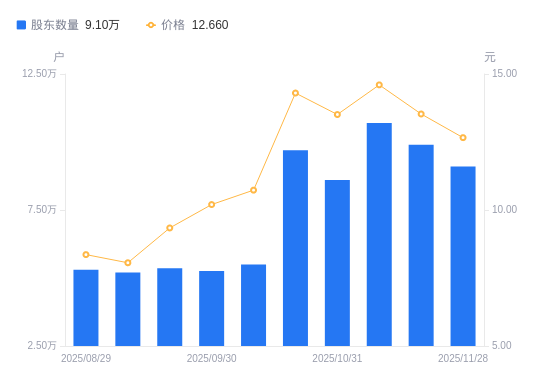 近一年(2024年11月29日至2025年11月28日),海峡股份A股股东户数从3.7万户,增加至9.1万户,增幅145.95%,区间股价上涨106.19%。