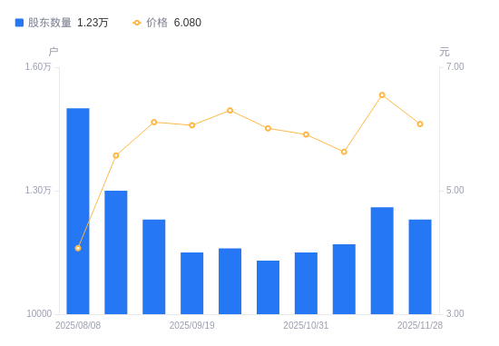 近一年(2024年12月10日至2025年11月28日),ST瑞和A股股东户数从2.23万户,减低至1.23万户,降幅44.84%,区间股价上涨47.22%。