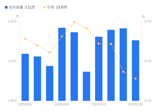 近一年(2024年11月30日至2025年11月30日),城发环境A股股东户数从2.25万户,减低至2.11万户,降幅6.40%,区间股价上涨5.28%。