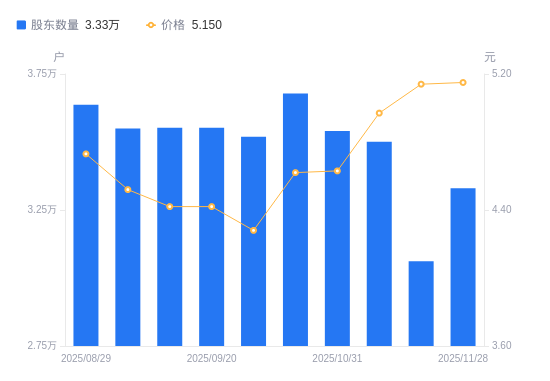 近一年(2024年12月10日至2025年11月28日),莱美药业A股股东户数从2.83万户,增加至3.33万户,增幅17.47%,区间股价下跌14.59%。