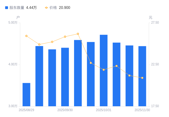 近一年(2024年12月10日至2025年11月30日),博威合金A股股东户数从3.89万户,增加至4.44万户,增幅14.03%,区间股价上涨19.57%。