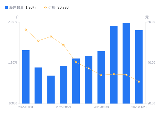 近一年(2024年11月29日至2025年11月28日),海特生物A股股东户数从1.03万户,增加至1.9万户,增幅84.05%,区间股价上涨10.52%。