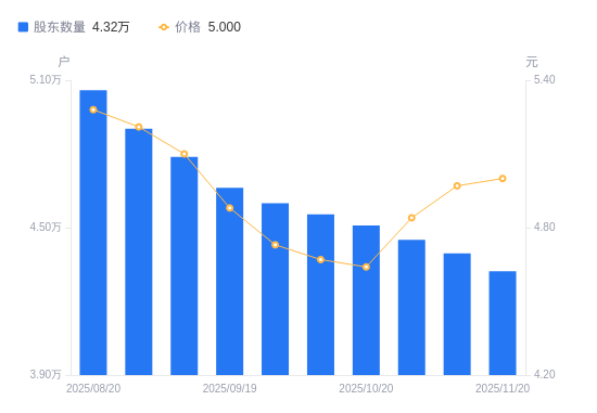 近一年(2024年12月10日至2025年11月28日),ST任子行A股股东户数从6.94万户,减低至4.27万户,降幅38.51%,区间股价下跌34.05%。