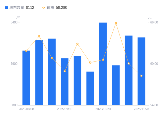 近一年(2024年11月29日至2025年11月28日),美信科技A股股东户数从7370户,增加至8112户,增幅10.07%,区间股价下跌2.82%。