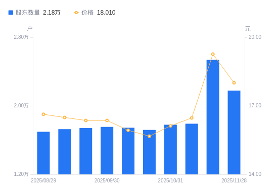 近一年(2024年11月29日至2025年11月28日),同益股份A股股东户数从1.98万户,增加至2.18万户,增幅9.82%,区间股价上涨8.69%。