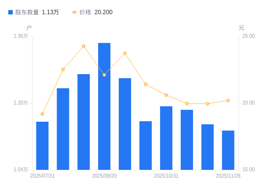 近一年(2024年11月30日至2025年11月28日),铭利达A股股东户数从1.16万户,减低至1.13万户,降幅2.37%,区间股价下跌6.05%。