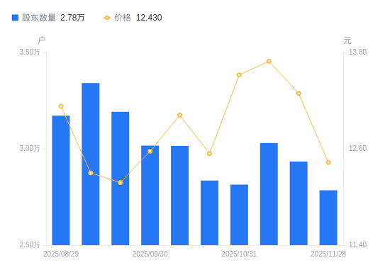 12月5日消息,数据显示,截至2025年11月28日,沃顿科技A股股东总户数为2.78万户,较上期(2025年11月20日)减少1494户,降幅5.09%。公司最新A股总股本为4.73亿股,其中流通A股4.22亿股,户均持有流通A股数量为1.52万股,较上期增加771.64股,增幅5.37%;户均持流通A股市值18.84万元,较上期减少2777.27元,降幅1.45%。