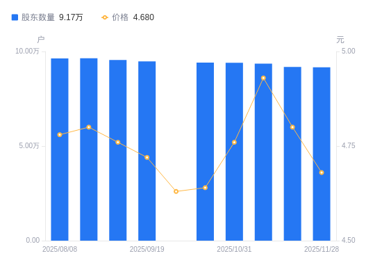 近一年(2024年11月29日至2025年11月28日),南玻AA股股东户数从10.73万户,减低至9.17万户,降幅14.54%,区间股价下跌13.99%。