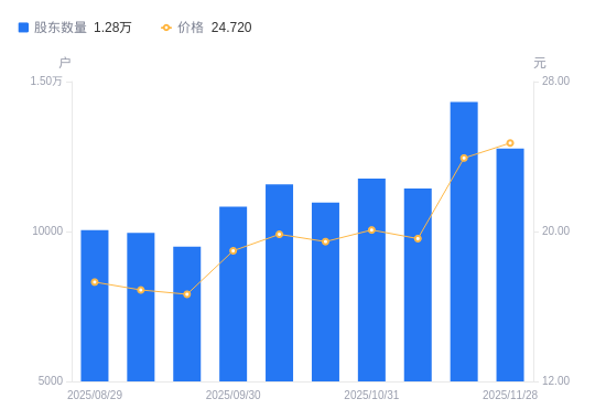 近一年(2024年11月29日至2025年11月28日),宁波色母A股股东户数从8156户,增加至1.28万户,增幅56.58%,区间股价上涨68.73%。