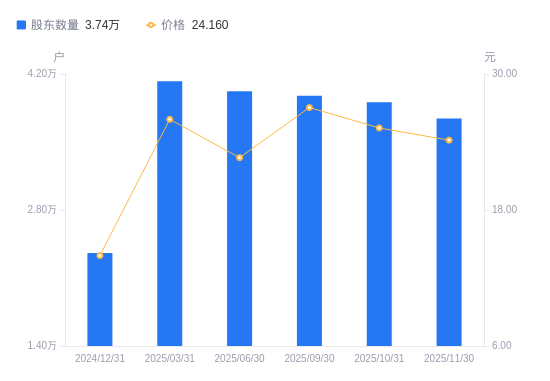 近一年(2024年12月31日至2025年11月30日),优刻得A股股东户数从2.36万户,增加至3.74万户,增幅58.70%,区间股价上涨62.15%。